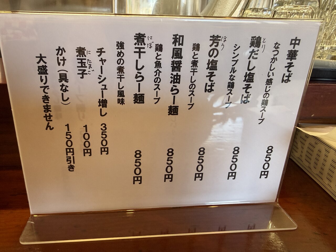 偏平な多加水系の縮れ麺は、やや薄めながら高加水率で、麺にとっては厳しい条件にもかかわらず、しっかりとしたコシを保っていた。スープの絡みも良好である。スープは鶏ガラと豚骨のブレンドに野菜を加えたものと思われ、あっさりとしながら、ほとんど塩味と錯覚するほど繊細な醤油味。旨味の引き出し方が見事だった。チャーシューは脂多めで薄味のタイプ。