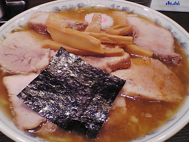 コメント:スープは豚骨ベースの醤油味でかなり強めにカツオなどの魚系のダシを利かせたもの。東京西部というよりは大勝軒系と言ったほうが良いと思うが、便宜上東京西部ラーメンに分類。最近は色々と細かい工夫をして料理を目指している店がどんどん出てきているが、こういうラーメンを食べると何かほっとするような気がする。これで強烈にニンニクが効いていたりしたらさらに良いと思うが、このレベルでも十分に満足。