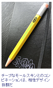 『チープなモールスキンとのコンビネーションは、相性・デザイン共に抜群だ』ってなとこでどうでしょ?