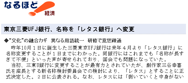 三菱東京UFJ銀行の名称が変更されるのは大変喜ばしいのですが、それにしてもレタスって、トマトのパクリじゃーん。カタカナ三文字は評価できるけど。