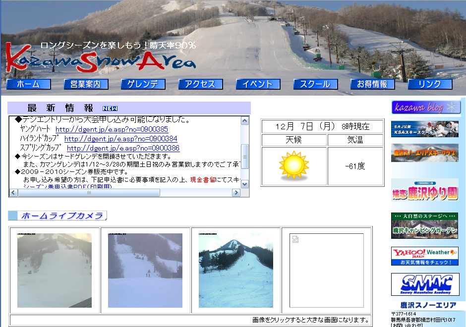 今月19日、20日に神奈川県スキー連盟の競技大会開幕戦が鹿沢スノーエリアで予定されている。ところが、この暖冬。雪がなくて大会が中止になった場合、申し込みのお金から1000円とられちゃう(2種目の場合は2000円)ので、ギリギリまで申し込みを待っているのだけれど、さっき、「雪は降ったのかなー」と思って鹿沢のウェブサイトを見てみてびっくり仰天。鹿沢、大変なことになってるな!これじゃぁ、雪があっても、滑るのは嫌だよ(涙)ちゃんと回復するんだろうか。うーーーーーーーん。非常に心配。やっぱ、エントリーは見合わせるかなぁ。最終決断は明日の夜中。