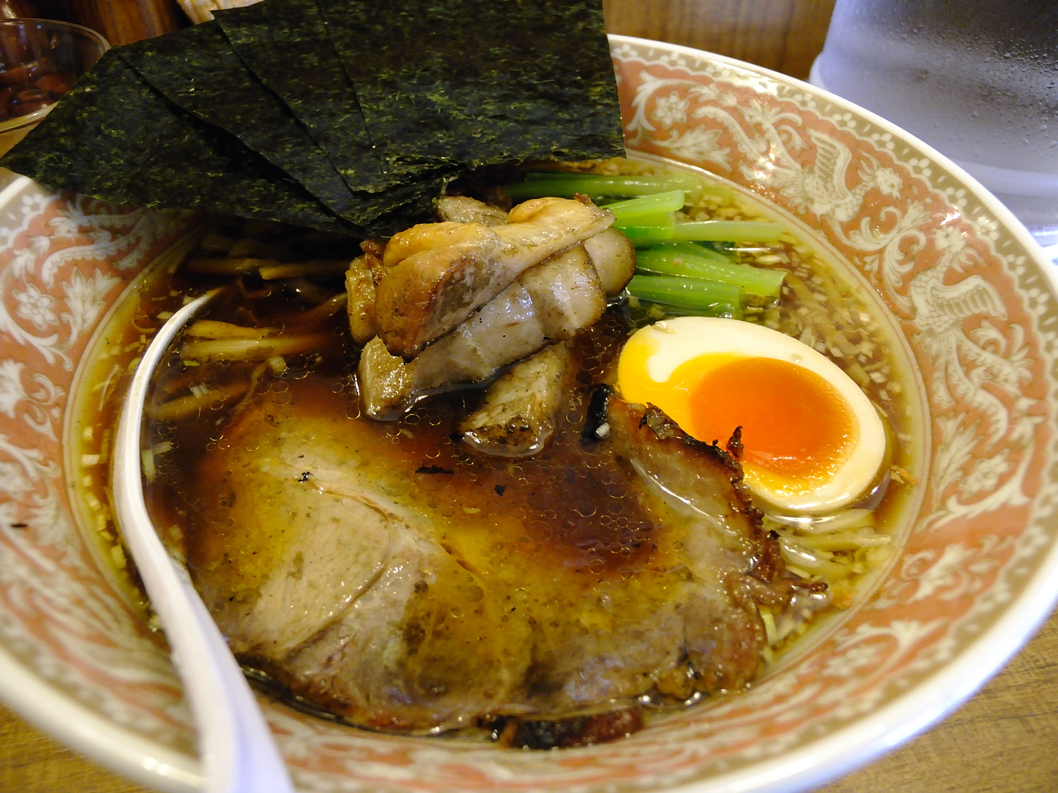 スープは鶏とんこつブレンドの醤油味。醤油にこだわっているようだが、残念ながらそういうものを全部吹き飛ばしてしまうほどに焦げたラードの苦味が前面に出ている。狙ってやっているのか、チャーシューからにじみ出てしまったのかはわからないが、とにかく苦い。これでは他の様々な工夫がだいなし。もともとのベースが素材のダシに依存したデリケートなスープなので、ちょっとしたことでバランスが崩れてしまう。
