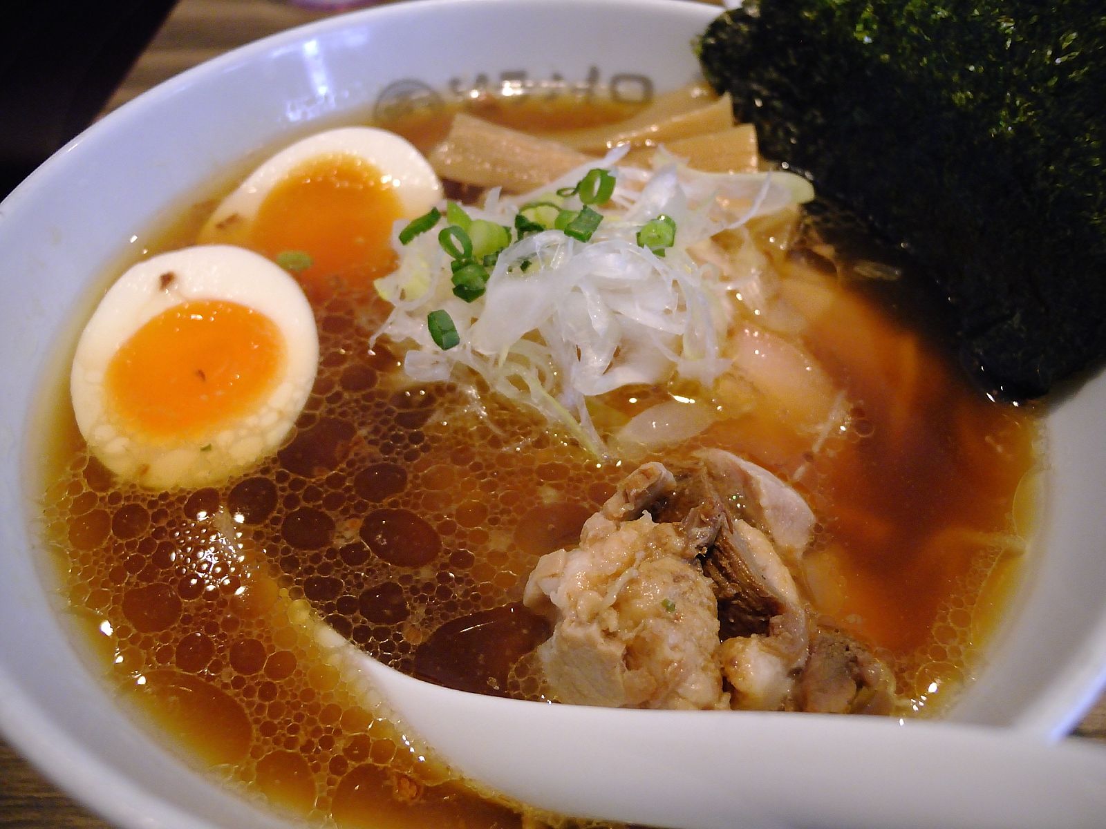 スープは鶏ベースの醤油味。バランス良く仕上がっていて美味しい。ただ、いくつかのスープを混ぜているのか、あるいは返しがきちんと混ざっていないのか、提供された時点では味が不均一。一口食べて「あれ?味がない」と思ったのだけれど、混ぜたらちゃんと味があった。ラーメンは普通ちゃんとまざった状態で提供されるので、「ちゃんと混ぜてからどうぞ」と教えてくれないとわからない。