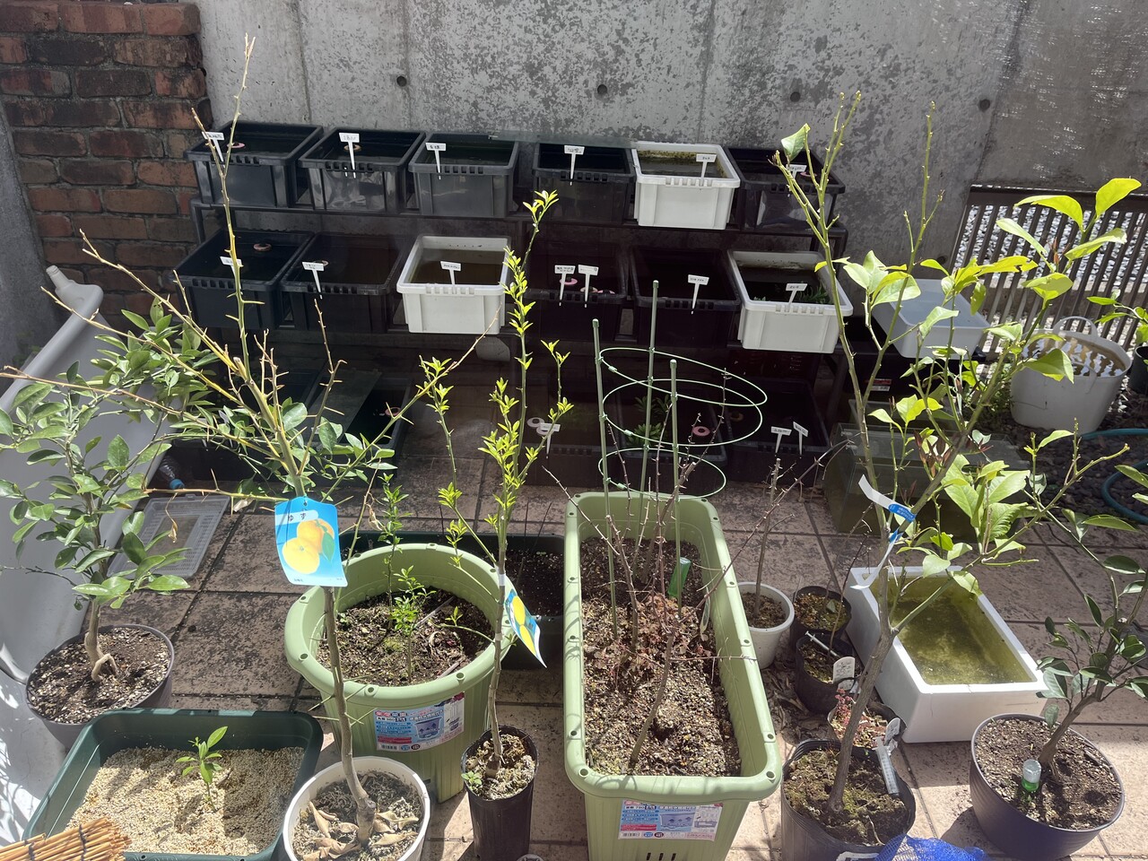 手前の大きいのはゆず、真ん中のプランターは山椒、その右に3つある丸いのも山椒。